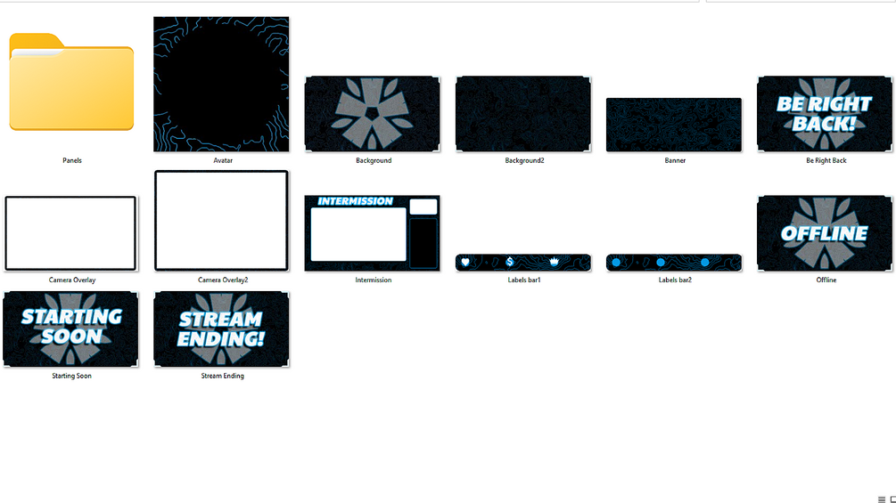 The Pack includes: Starting Soon Screen, Stream Ending Screen, Be Right Back Screen, Intermission Screen, 2 Background Images, 16 Description Panels, Transparent Avatar, 2 Label Bars, Banner, 2 Webcam Overlays (Wide - 16:9, Square - 4:3).